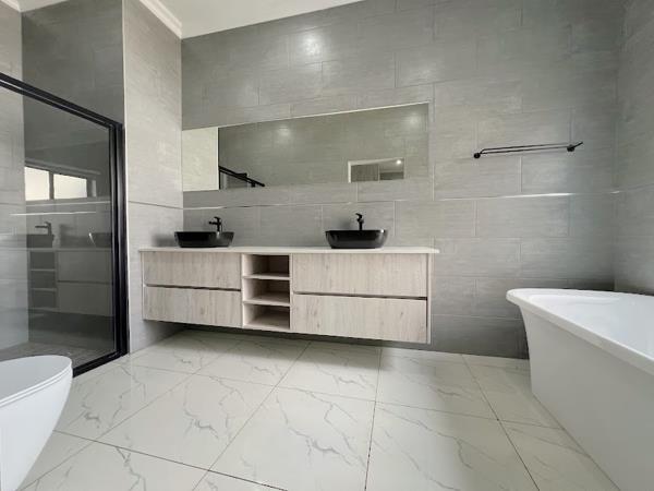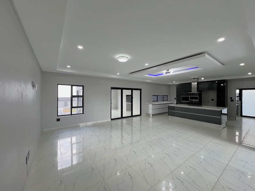Just like new with a few improvements such as blinds, curtains, four air-conditioning units & a solar system..The lower level offers a double volume entrance hall, a study / home office, a cinema room with block-out blinds and movie projector (3rd garage) a guest toilet, an ultra-modern kitchen with center island & separate scullery / laundry area, an open plan dining room, an open plan lounge, an enclosed and air-conditioned entertainment area / braai room with built-in braai. The living areas downstairs (lounge and dining room) open up to the entertainment area with stacking doors and the entertainment area is fitted with an additional two sets of stacking doors that open up to the garden and pool area. The fifth bedroom is also located on the lower level and is served by the fifth en-suite bathroom. The upper level offers a light and airy pajama lounge, a linen closet, four more modern bedrooms, two balconies overlooking the garden, and four more en-suite bathrooms. The master bedroom has a separate dressing room with an impressive amount of cupboard space, is served by a luxurious full en-suite bathroom, and opens up to a private balcony. Swimming pool and boma. Domestic accommodation. Three automated garages, of which one is utilized as a movie theater.