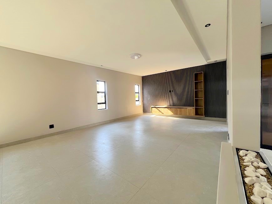 Exceptional home built in the sought after Six Fountains Estate. The lower level offers a double volume entrance hall, a guest toilet, a private formal lounge, an open plan dining room, an open plan family lounge, an ultra-modern kitchen with gas hob + electric hob + island breakfast nook, a separate scullery / laundry area, and an enclosed patio with built-in braai. The fifth / guest bedroom is also situated on the lower level, is served by an en-suite bathroom with a shower, and opens up to the garden with a sliding door. The upper level offers an open plan pajama lounge, a large study / office / children''s play room with built-in cupboards, three balconies, and another four bedrooms that are served by four full en-suite bathrooms. The master bedroom has a separate dressing room, opens up to a balcony with sliding door and is served by a luxurious full en-suite bathroom. All five bedrooms are fitted with a great deal of closet space. The living areas on the lower level lead to the patio with two sets of stacking doors and there is a third set of stacking doors that separate the braai area from the pool area and garden. Domestic accommodation. Three automated garages, two with built-in cupboards for storage. Large swimming pool. Boma / fire pit. Irrigation system. Glass balustrades.
