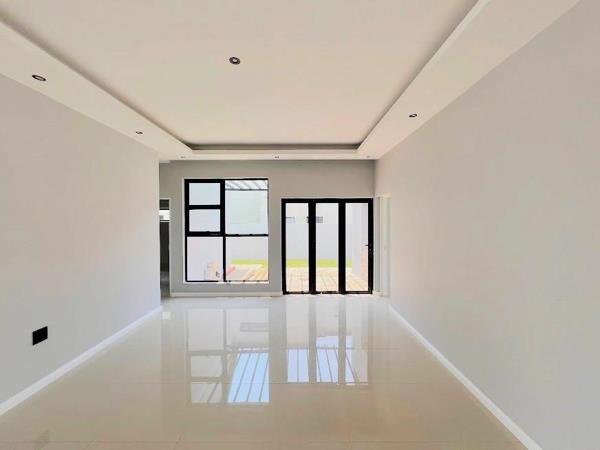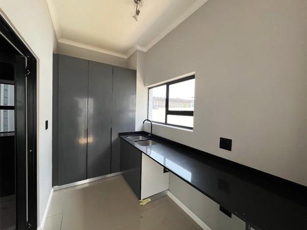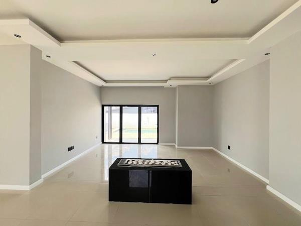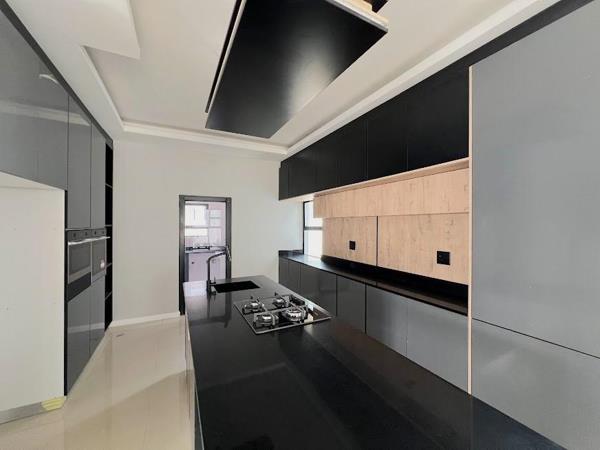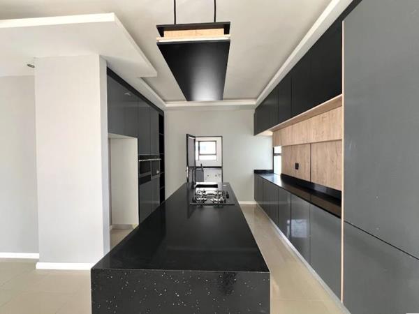 Newly built four bedroom home with exceptional finishing. The lower level offers a welcoming double volume entrance hall, a study with built-in desk and cupboards, an ultra modern kitchen with island nook & separate scullery / laundry area, a guest toilet, an open plan dining room, an open plan family lounge and an open plan formal lounge with a gas fireplace dividing the two reception areas. The dining room opens up with sliding doors to a veranda with a pergola, and the lounge opens up to the garden and pool area with stacking doors. The fourth bedroom is also located on the lower level and is served by a full en-suite bathroom. The upper level offers a spacious pajama lounge that leads out to a large patio (shared with master bedroom), three spacious bedrooms and two more full double bathrooms. The master bedroom is served by a separate dressing room & a full en-suite bathroom, and opens up to the balcony with sliding doors. The outside area offers an infinity pool with water feature and a large boma. Domestic accommodation. Three automated garages with glass doors.