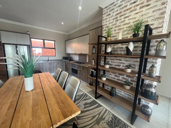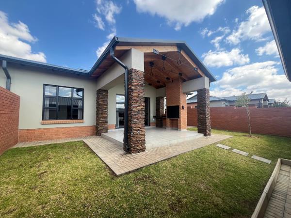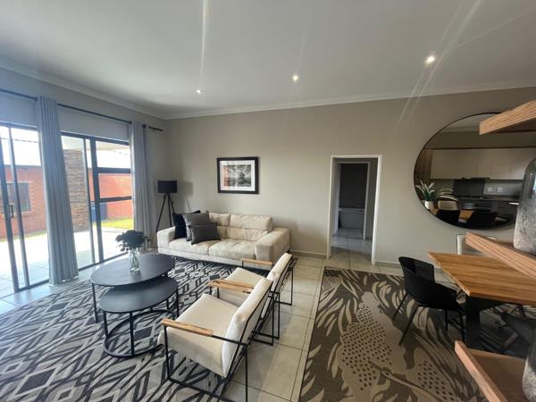 The open plan living and dining room area creates a seamless flow, perfect for both family living and entertaining guests. Large sliding doors opens up onto a covered patio with a build in braai, overlooking a private garden. Ideal for weekend gatherings or simply relaxing outdoors.