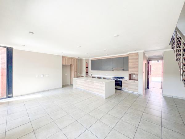 Stylish open-plan kitchen with premium finishes, a gas hob, ample cupboard space, and provisions for three appliances plus a double-door fridge.