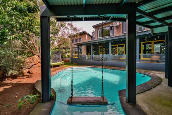 Overlooking a sparkling swimming pool, built-in braai, boma, and generous garden