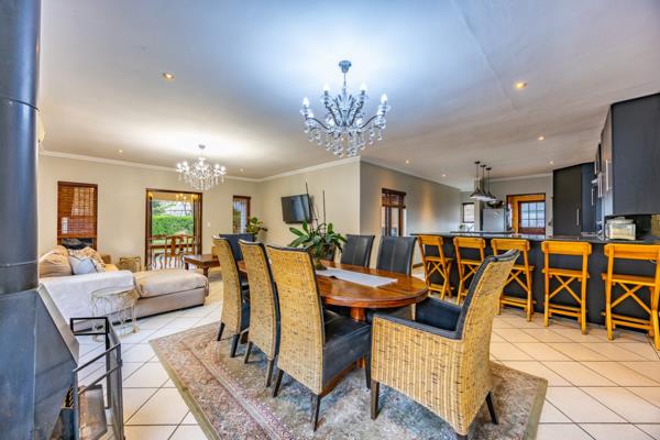 Step outside to a private outdoor sanctuary designed for leisure and entertainment. The lush garden features a sparkling swimming pool, surrounded by practical paving, and mature trees providing natural shade and privacy. Multiple dedicated entertainment zones include a covered patio perfect for al fresco dining, a built-in braai for culinary adventures, and a charming fire pit for evening gatherings. This pet-friendly property ensures enjoyment for all family members.