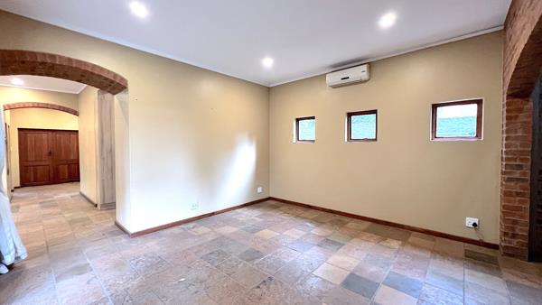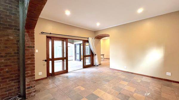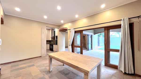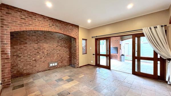 Inside, an open-plan layout seamlessly connects the dining area with a modern kitchen, complete with visible appliances and a pantry. Durable tiled flooring and recessed lighting feature throughout, while exposed brick accent walls and elegant archways add character. Large wooden sliding doors provide natural light and effortless indoor-outdoor flow to the garden and patio, with air conditioning ensuring comfort. The three well-proportioned bedrooms, including an ensuite, all feature practical built-in wardrobes and large windows.