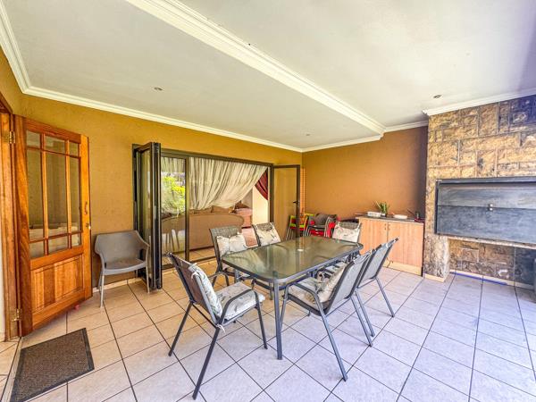 Open Plan Living: The ground floor features open-plan design connecting the kitchen and dining areas, formal lounge and TV lounge opening onto a large, covered patio with a built-in braai. Stacked aluminum doors open from the lounge to the patio, enhancing indoor-outdoor living.