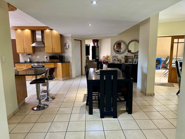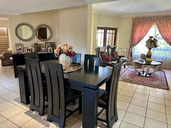 After entering through the impressive front door, you find that downstairs offers three large, gracious living rooms (one with a fireplace) with stack/french doors opening onto a very sheltered patio with a built in braai.