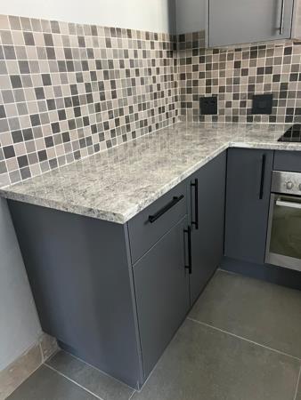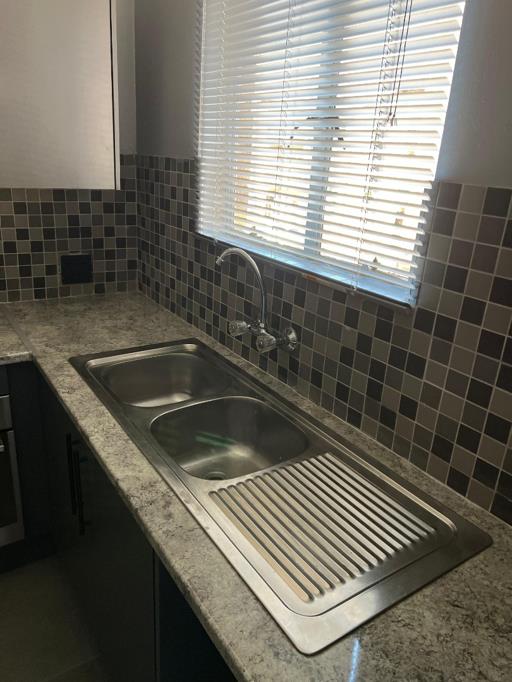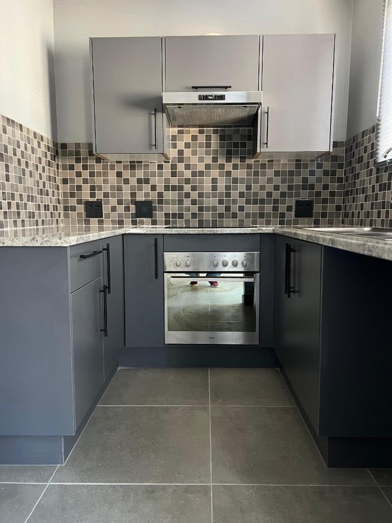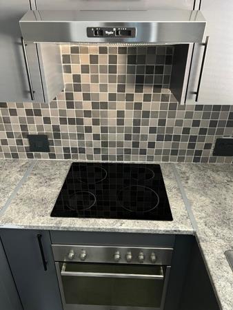 The heart of this home is its modern U-shaped kitchen, featuring sleek dark grey cabinetry complemented by a multi-tone mosaic tile backsplash and light speckled laminate countertops. Equipped with built-in stainless steel appliances, including an electric hob, oven, and extractor fan, it provides both functionality and style. A double stainless steel sink with a draining board and ample storage complete this well-appointed space, adjacent to a dedicated dining area.