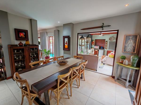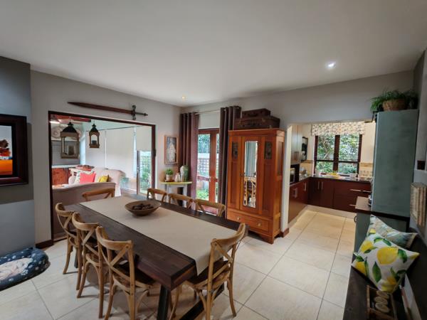 The living area includes a gas fireplace, adding warmth and character to the space. The living area opens out to an enclosed under cover patio with a built in braai. Fitted with aluminium stacking doors that open up to the swimming pool area and a beautifully maintained, irrigated garden. Perfect for easy indoor-outdoor living and entertaining.