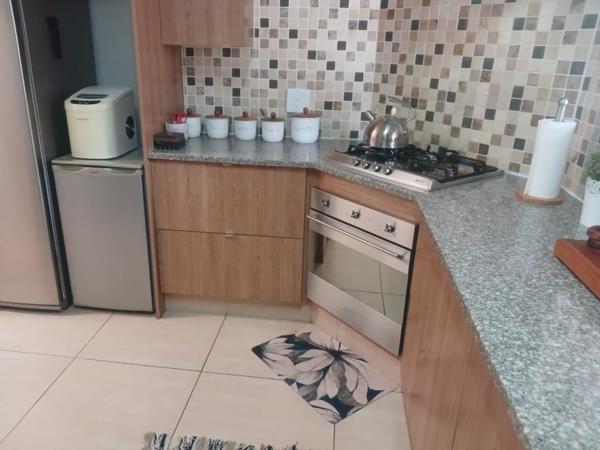 The modern kitchen boasts tiled floors, granite counter tops, ample cupboards, three place washing machine connection points, a gas Hob, an under-counter electric oven and a convenient scullery at the back.
