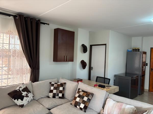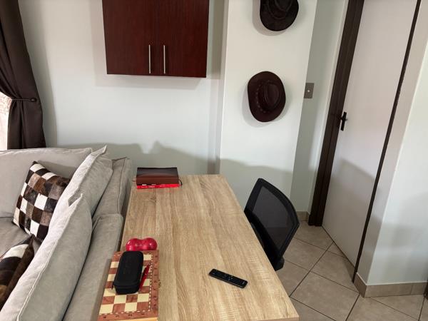 The unit features an open-plan kitchen flowing into the dining area and lounge. The kitchen has been upgraded with a new gas hob and a thermo-fan oven. Additional improvements include new light fittings, plugs, switches, and door handles, along with extra power points installed throughout the home. A standby water system has been added in the courtyard area to ensure convenience during water interruptions. An extra water point has also been installed for an additional appliance. The property includes a double garage, a standard feature in the complex, providing