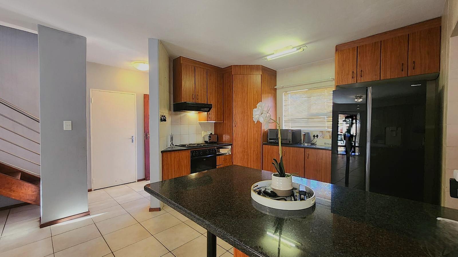 The ground floor features a bright open-plan living and dining area, fitted with air conditioning, and tiled floors throughout, flowing seamlessly into an open-plan kitchen designed for practicality and ease of use. The kitchen offers ample cupboard space, granite countertops, a breakfast nook, and the added benefit of a separate scullerylaundry area, keeping the main living space neat and uncluttered.