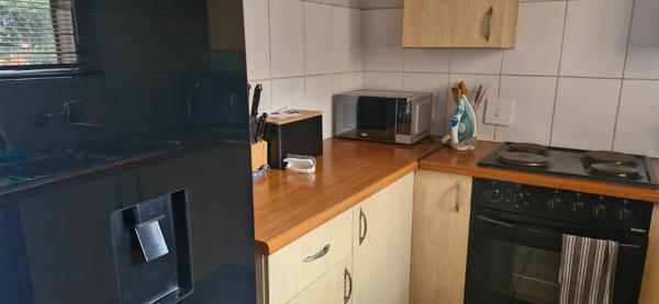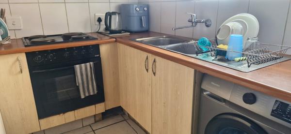 U-shaped kitchen with space for a fridge and washing machine, or dishwasher, if one adds plumbing in the lockup garage for the washing machine. The footboards do need attention.