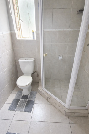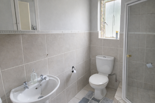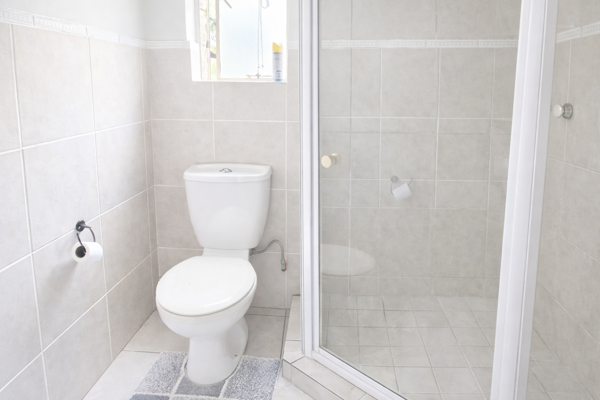 1 bathroom with shower, basin and toilet. The tile grout in the shower may need replacement.