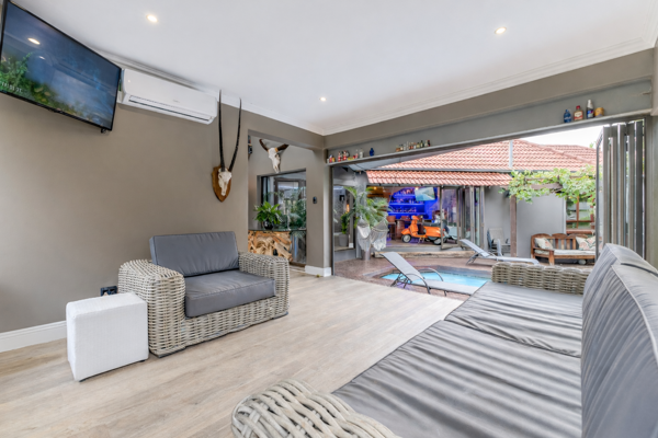 The beautifully redesigned kitchen flows seamlessly into an expansive open-plan entertainment area, complete with a stylish bar and built-in braai. These spaces open directly onto the swimming pool, creating the perfect indoor-outdoor lifestyle for entertaining family and friends.