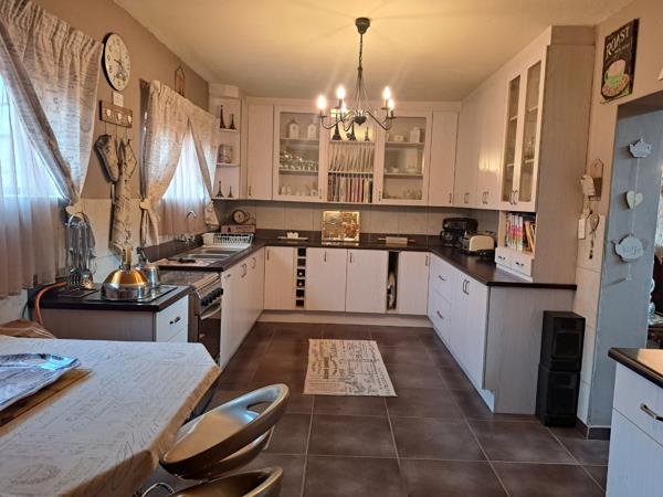The interior boasts a generous layout designed for comfort and functionality. With three distinct lounges and two dining rooms, including spacious open-plan areas, there is abundant room for various activities and gatherings. The property features two kitchens, providing flexibility for different culinary needs or potential for a separate utility space. The main kitchen offers ample cabinet storage and counter space, while a dedicated scullery area provides additional convenience with a sink and storage.