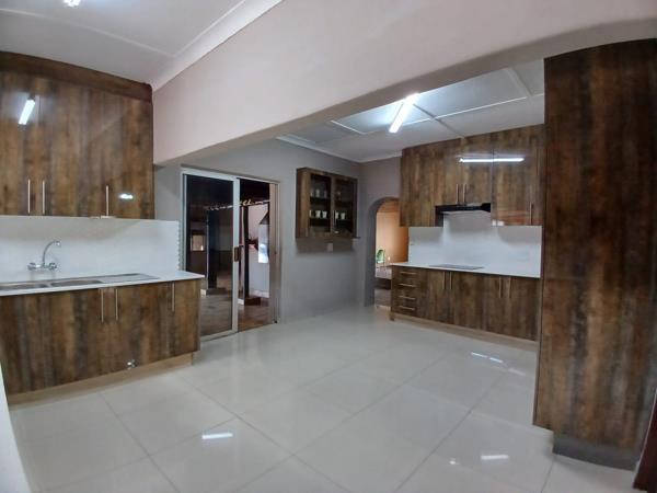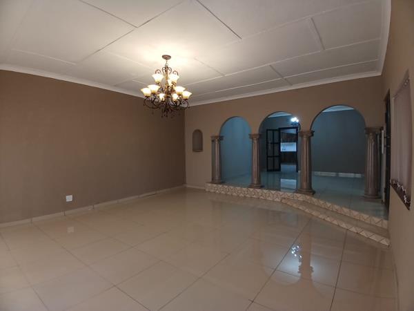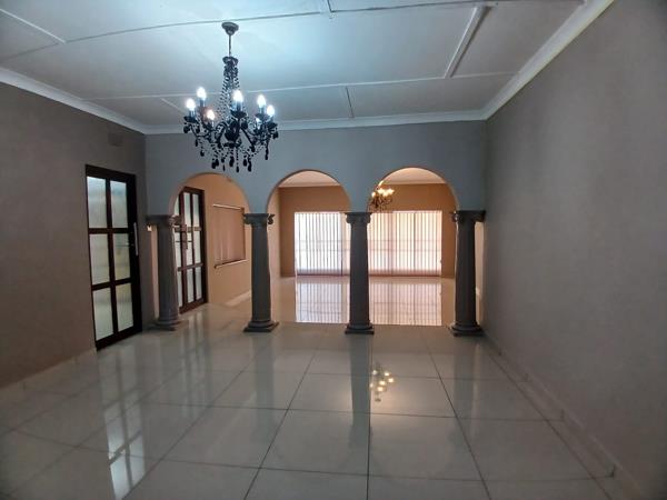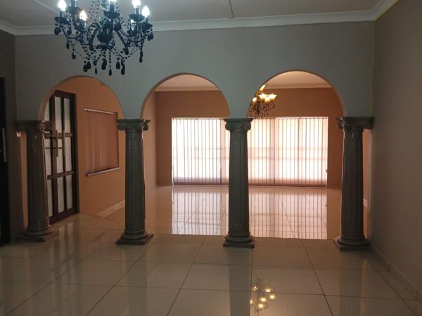 Step inside to discover a spacious and thoughtfully designed interior. The home boasts two comfortable lounges, including a dedicated family TV room, and a separate dining area, all finished with glossy tiled flooring and neutral walls. Elegant archways with decorative pillars and stylish chandeliers enhance the open and flowing ambiance. The modern kitchen is a highlight, equipped with extensive wood-grain cabinetry, clean white countertops, a double sink, integrated hob, and extractor fan, complemented by a sliding glass door for natural light and outdoor access. A built-in bar adds to the entertainment potential.