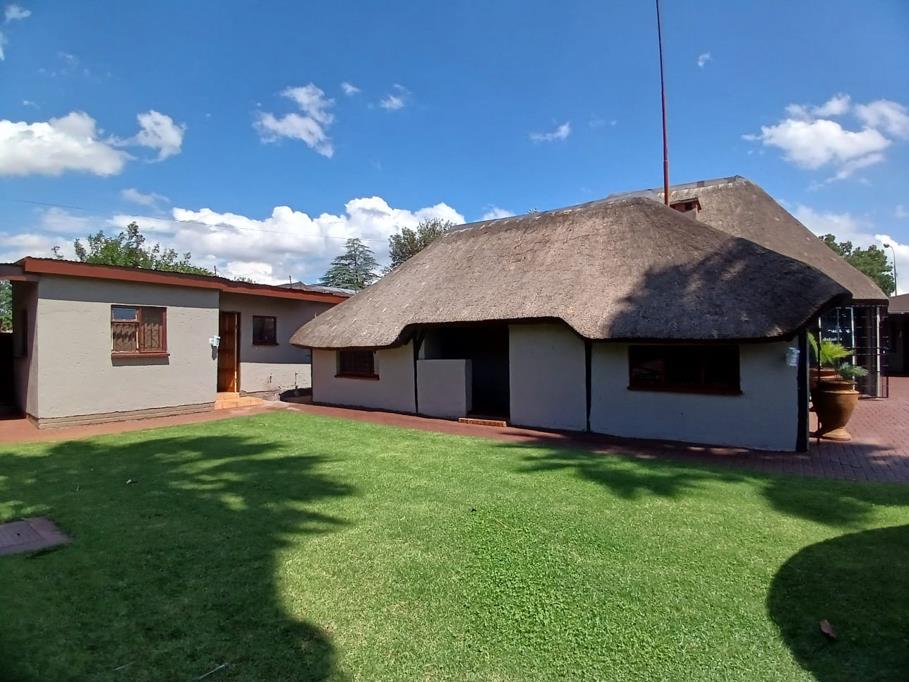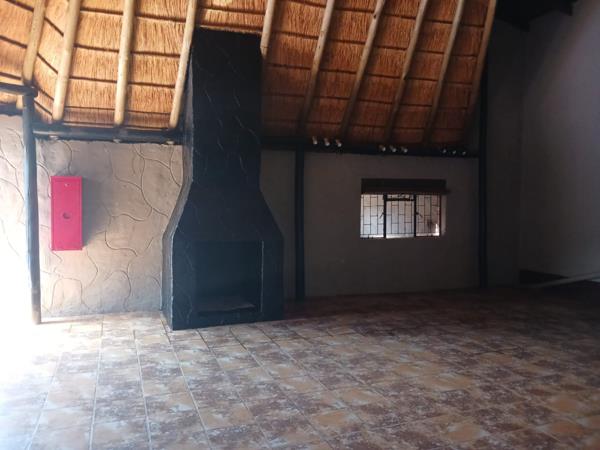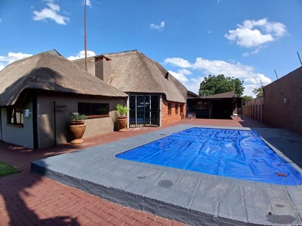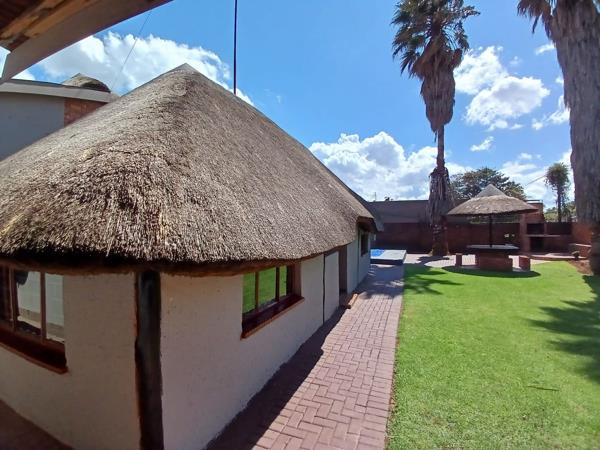 Nestled in the tranquil suburb of Oberholzer, Carletonville, this distinctive family home offers a unique blend of traditional charm and modern comfort. The property immediately impresses with its striking thatched roof architecture and well-maintained exterior. Set on a generous 1115 sqm erf, it features a lush green garden, paved pathways, and a large paved driveway leading to an extensive shade net carport for multiple vehicles, alongside two secure garages. This inviting frontage creates a welcoming first impression in a community-focused setting.