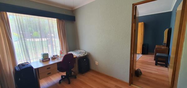 Inside, the house offers 4 spacious bedrooms and an additional room that can be used as a study or fifth bedroom. The main bedroom features an ensuite bathroom with both a bath and shower, while the remaining bedrooms are serviced by two separate bathrooms and mdashone with a bath and shower and the other with a bath only. The bedrooms are fitted with oak wood built-in cupboards, with the main bedroom having carpet flooring and the others with laminated flooring.
