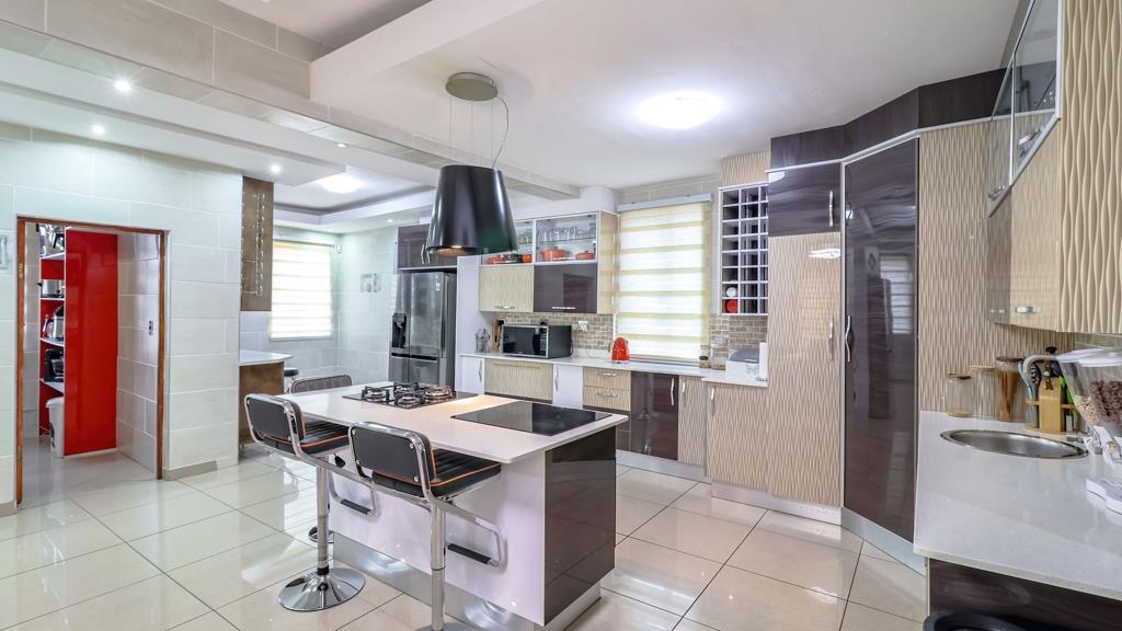 Step through the doors of the main double-storey residence, and you are immediately welcomed by a reception that flows effortlessly into a formal lounge, perfectly balanced by a cosy family TV room warmed by a built-in biofuel fireplace. From here, the home opens into an expansive open-plan dining and kitchen area that can only be described as a showstopper. Think high-end marble finishes, dual cooking stations with both gas and glass electric hobs, a central island fit for gourmet creations, a walk-in pantry with room for everything, plus a separate scullery that leads outside to a space currently equipped as a laundry with an en suite toilet and shower, but which can also be used as staff quarters with its own private bathroom. This is a kitchen designed not only for living but for entertaining in style.