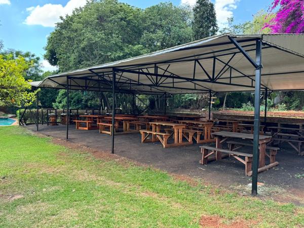 For remote workers or those who need a quiet place to focus, a dedicated study provides the perfect workspace. Two built-in bars open onto a second entertainment patio, creating a fantastic setting for social gatherings. Additional outdoor features include a sparkling swimming pool, extra ablution facilities, a boma area for evenings around the fire, and tranquil ponds with newly installed water feature pumps that elevate the serene ambiance.