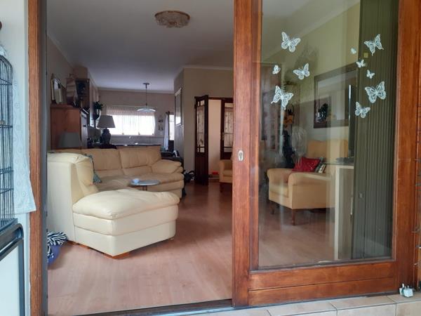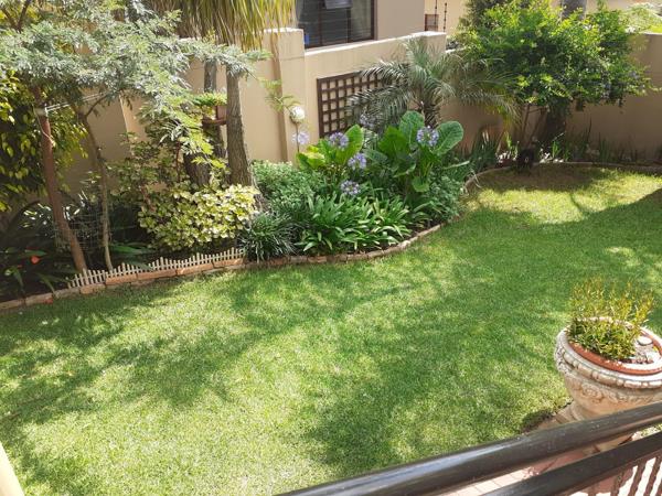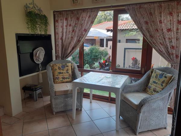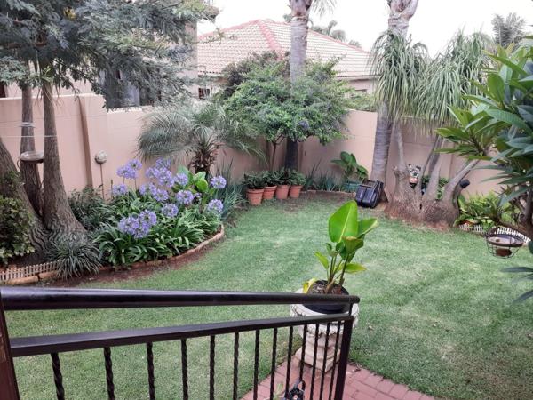 This full title cluster is pet friendly with a spacious wrap-around garden. Prepaid water & electricity. 3 Bedrooms serviced by 2 neat bathrooms.The lounge is modern with granite tops & is open plan together with the lounge.The sun-room has lovely wooden sliding doors & an indoor braai. There is a double garage, one side is motorized with a double shade-cloth carport in front of the unit for additional parking. Security on windows is excellent. The complex is neat & well run, Call agent now to view.