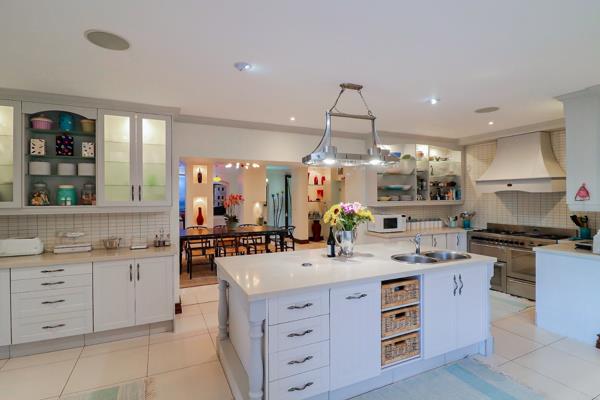 Perfect for entertainment and relaxed living, the residence features easy-flow, spacious, and open-plan reception areas. A cobbled paved forecourt with parking for 5 cars leads to an alfresco dining space with an extensive enclosed patio, gas braai, and a beautiful caesar stone kitchen equipped with a double gas stove, walk-in fridge, and a bright breakfast eating area.