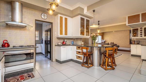Beautiful kitchen with breakfast counter, gas hob and oven, space for double fridge which extends to scullery with space for two under counter appliances. Large walk-in pantry cupboard