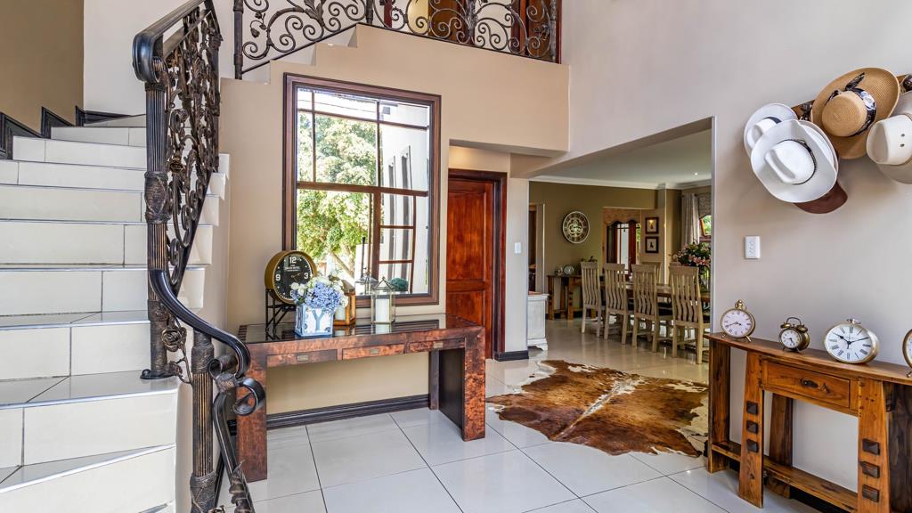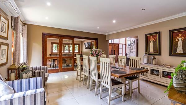 The open-plan dining area flows seamlessly through elegant wooden doors into a sleek enclosed patio and entertainment room. This impressive space features a built-in braai, contemporary bar with bar fridge, stylish server windows, and stack doors that open onto the outdoor BOMA, perfect for effortless indoor-outdoor entertaining.