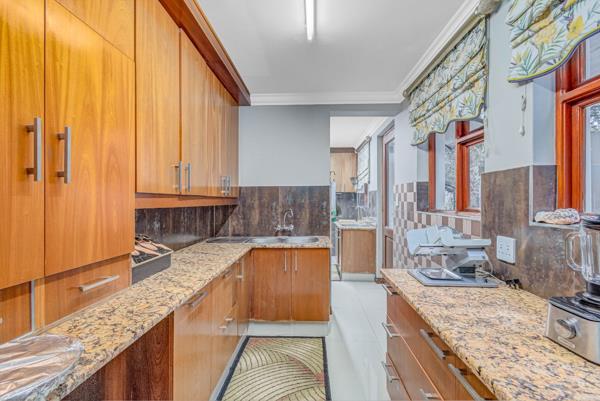 The heart of the home is a beautifully appointed kitchen boasting a central island, granite countertops, gas hob, double eye-level oven, prep bowl, solid wooden cabinetry, walk-in pantry, and a large separate scullery and laundry area with ample space for all appliances and a double-door fridge.