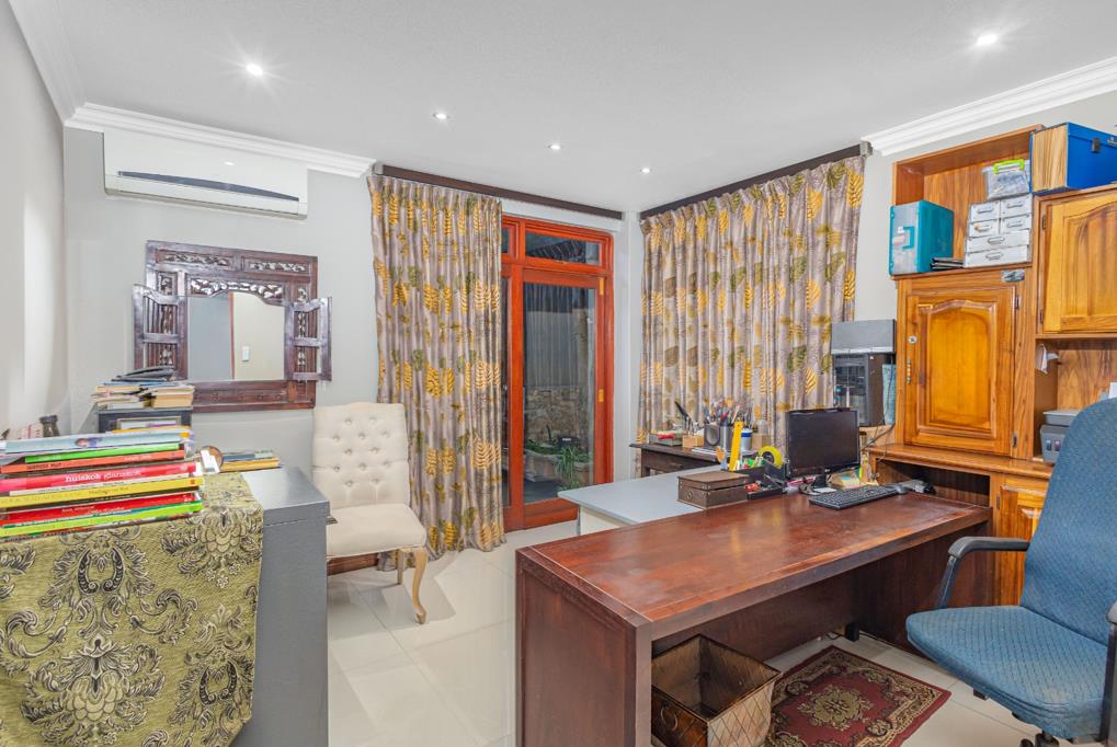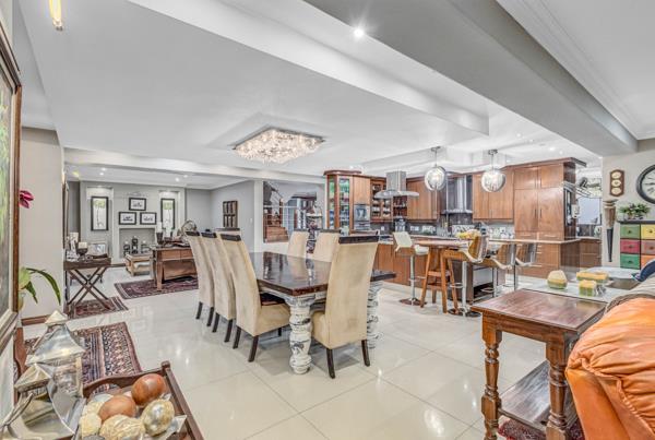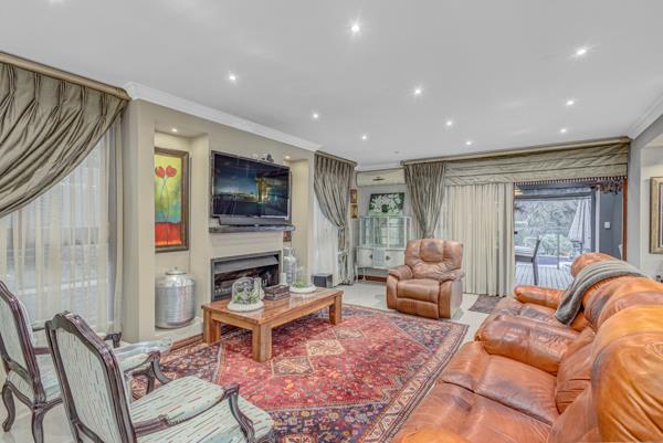 The spacious living areas open out onto a generous covered entertainment patio equipped with a built-in braai, bar, and drop-down blindsperfect for year-round entertaining. This inviting outdoor space overlooks a sparkling pool and manicured garden, framed by uninterrupted greenbelt views.