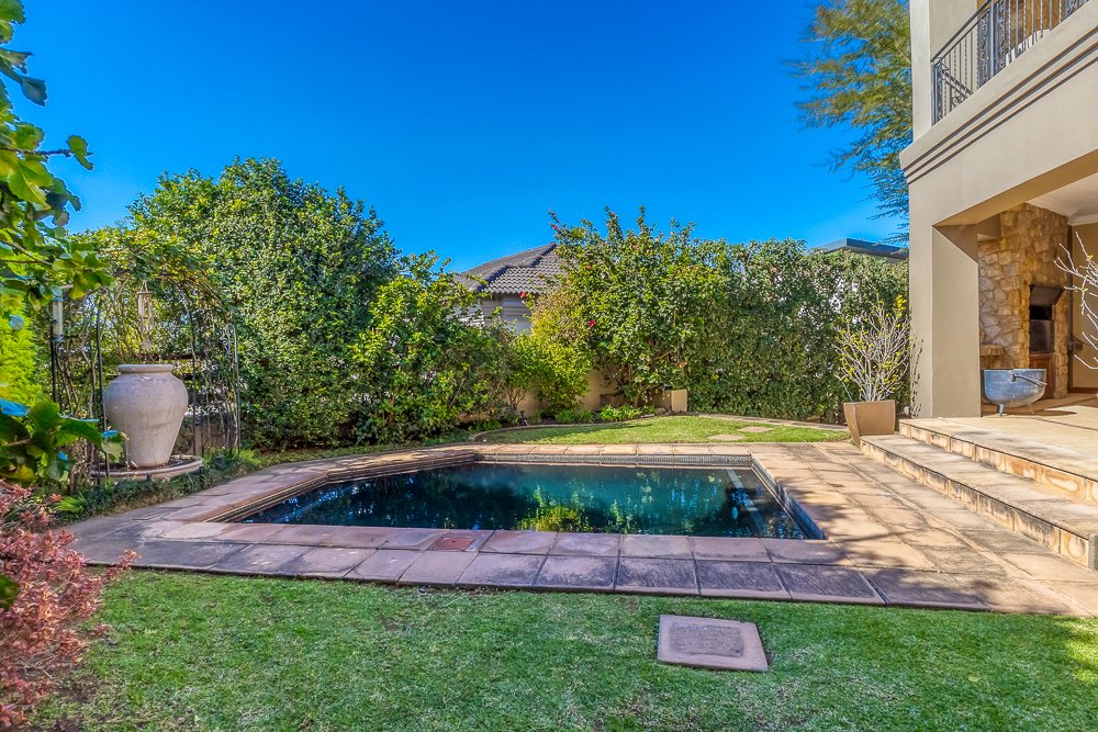 Additional highlights include staff quarters, an external storeroom, and three garages, along with ample parking for guests and trailers. The landscaped garden is impeccably maintained and surrounds a striking black marble-lite swimming pool ~ your own private escape.