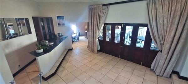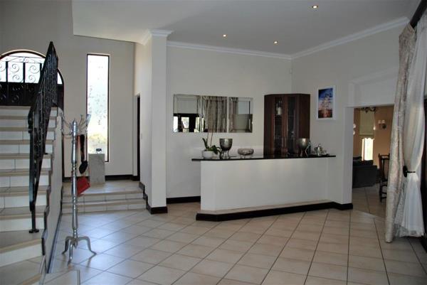 The covered entertainment area with drop down blinds has a built-in braai and pizza oven and showcases one of the most beautiful and spacious gardens which holds a sparkling heated swimming pool.