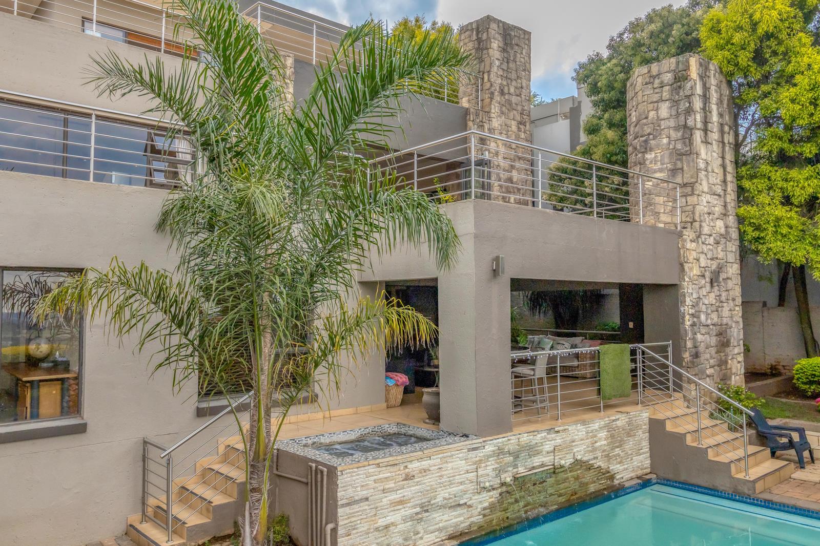 This level also boasts a cinema room, a games room, and a fully equipped bar, making it perfect for hosting gatherings or enjoying leisure time. A covered patio with a built-in braai overlooks the sparkling pool, boma, and beautifully landscaped garden, offering a serene atmosphere for outdoor entertainment.