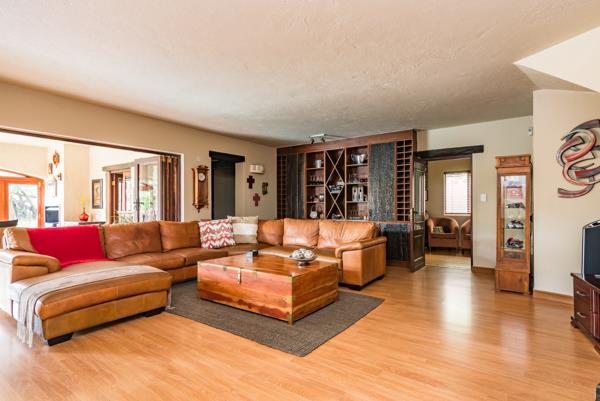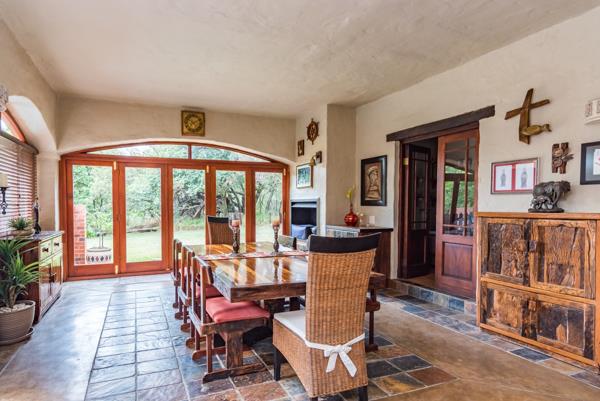 The enclosed patio area with a built in braai is ideal to make use of during the summer or the winter months as there are wooden stacker doors which can open towards the deck area revealing with the heated swimming pool and the garden on the greenbelt.
