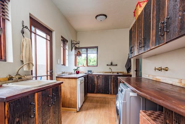 An open plan lounge area holds a crisp and warm gas fireplace for the winter days and over-looks the farm styled kitchen. The kitchen has a centred island which is perfect for a breakfast nook or serving table when you host a braai. There is a gas stove and space for a double fridge. The neatly tucked away scullery has 2 under counter spaces for your additional appliances.