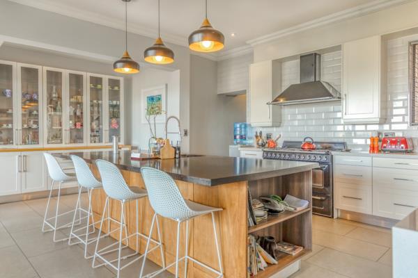 The heart of the home is a modern open-plan kitchen featuring an island, pantry, scullery, and sleek stacker doors that open to a covered patio with gas braai all overlooking breath-taking panoramic views. Adjacent living spaces include a dining room, TV lounge, and family room, all drenched in natural light.