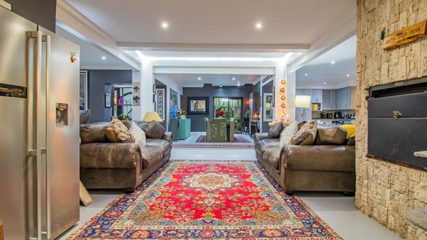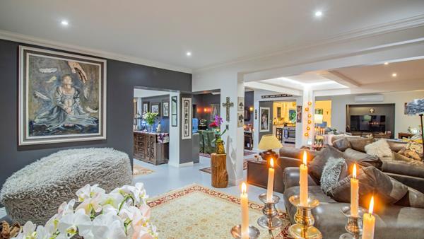 Exquisite 4-Bedroom Double-Storey Home with Exceptional Features - This elegant 490 m2 double-storey residence in the prestigious Featherbrooke Lifestyle Estate offers exceptional street appeal, highlighted by a grand arched entrance, striking columns, exposed brick accents, and a beautifully established garden. Designed for modern family living, the ground floor features two spacious open lounges, an inviting dining area enhanced by unique mosaic lighting, two guest bathrooms, and a stylish kitchen with quality cabinetry, a centre island, gas stove, mosaic feature lights, a cozy built-in breakfast nook, and a separate scullery. The living areas are air-conditioned for year-round comfort, and a cosy patio provides an intimate space for relaxed gatherings.