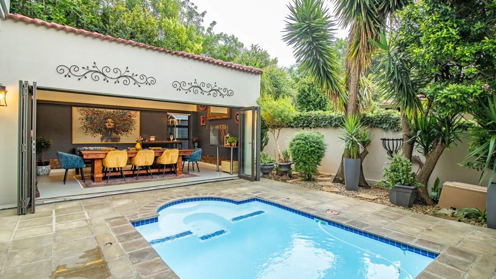 Outdoor living is equally impressive, with a solar-heated swimming pool, a charming pergola with built-in hanging chairs, and a serene water feature, complemented by a Wendy house for additional storage.