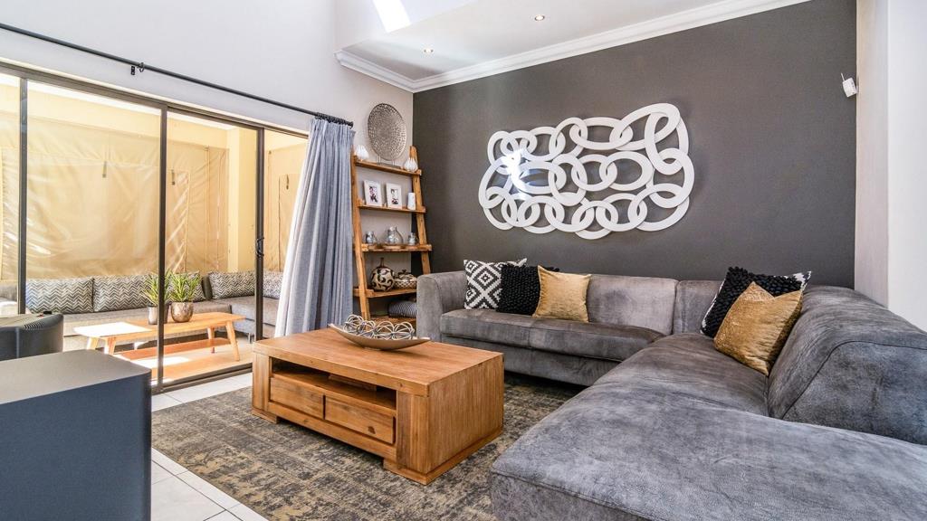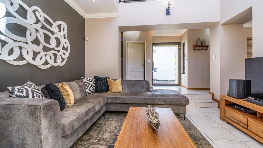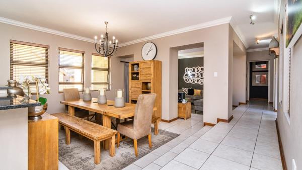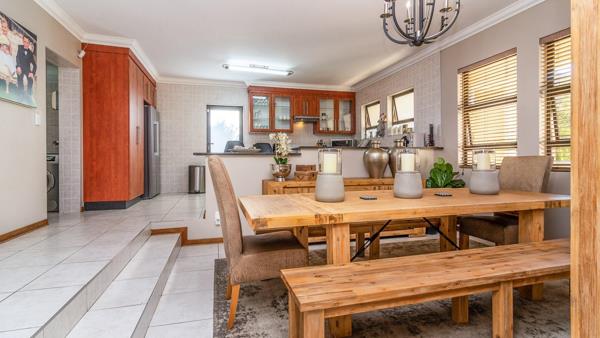 A downstairs bedroom, with its own bathroom, provides convenience for guests or extended family, while the modern kitchen is complemented by a separate scullery for added practicality. The open-plan living areas flow seamlessly onto a covered patio with built-in braai. With ample guest parking and a sought-after estate location, this property is the perfect choice for families who value space, style and security.