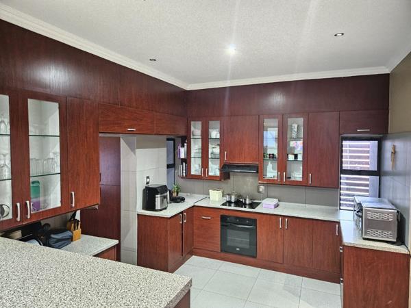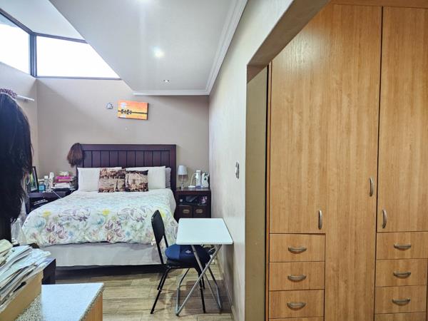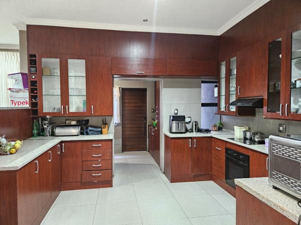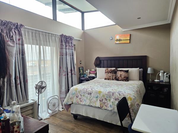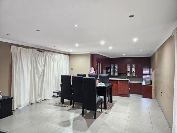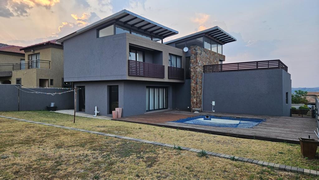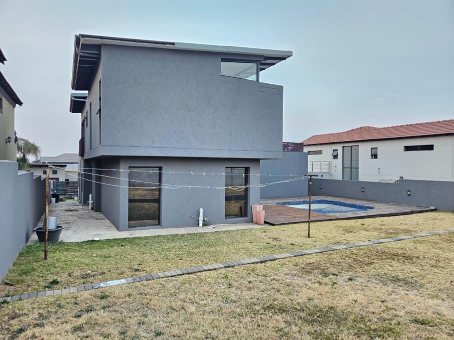 Discover an architectural masterpiece nestled within a prestigious estate in Homes Haven, Krugersdorp. This contemporary multi-story residence immediately captivates with its sophisticated blend of grey plaster, natural stone cladding, and warm wooden accents, presenting a truly distinctive faade. A patterned paved driveway leads to an integrated double garage, setting a tone of refined elegance and exceptional kerb appeal.