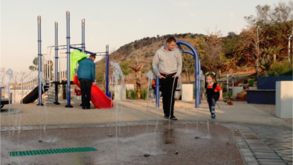 Cradle Ridge Estate is designed for family-friendly living, featuring a vibrant outdoor recreational area. Residents can enjoy a modern children''s playground complete with slides and climbing structures, alongside an interactive splash pad, perfect for leisure and entertainment. The estate is set against a picturesque backdrop of lush green hills, providing a serene and scenic living experience.