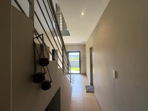 Upstairs, the spacious main bedroom serves as a private retreat, featuring generous cupboard space, a full en-suite bathroom with both bath and shower, and a balcony that invites in fresh air and natural light. Down the passage, the two additional bedrooms are thoughtfully positioned on either side of the full guest bathroom, also fitted with a bath and shower.