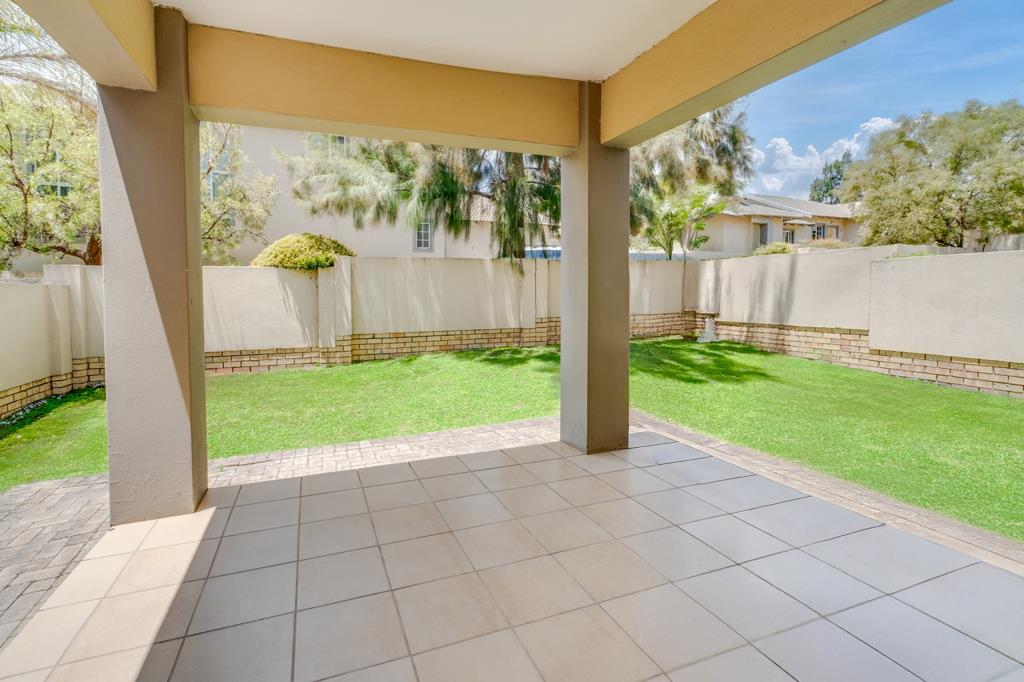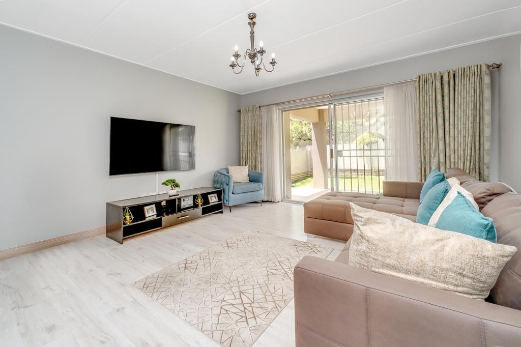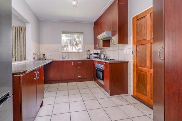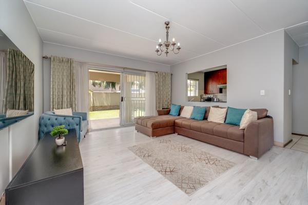 Discover comfortable living in this modern 3-bedroom, 2.5-bathroom residence, ideally situated within a secure complex in the Ruimsig Country Estate. Spanning 145 sqm, this home offers a contemporary design with a focus on natural light and practical living spaces. The bright, open-plan living area features modern light wood-look flooring and neutral grey walls, creating an inviting atmosphere. Large sliding glass doors provide abundant natural light and seamless access to a private, covered patio and a neatly manicured garden, perfect for outdoor relaxation and entertaining. The functional kitchen is equipped with ample dark wood cabinetry, a built-in oven, hob, and extractor fan, catering to all culinary needs.