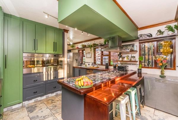 Designer kitchen with 3-tone colour finishes, Smeg built-in appliances, solid wood countertops, double fridge, prep bowl, scullery, pantry, and breakfast nook.