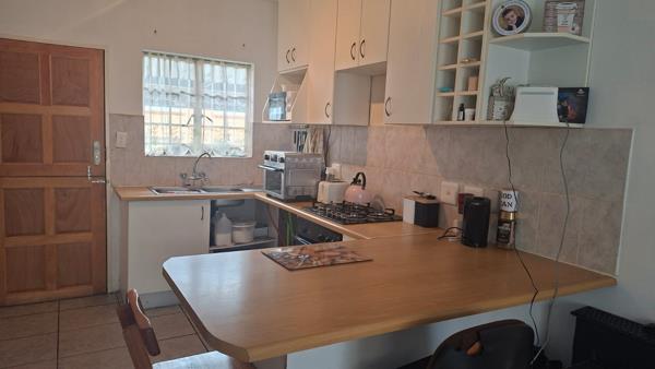 The functional L-shaped kitchen is equipped with white cabinetry, light wood-look countertops, a hob, and a double sink. An extended counter serves as a convenient breakfast bar, perfect for casual dining. The property comprises two well-proportioned bedrooms and a single bathroom, providing essential comfort for residents. While compact, the layout is efficient, ensuring a practical living arrangement.