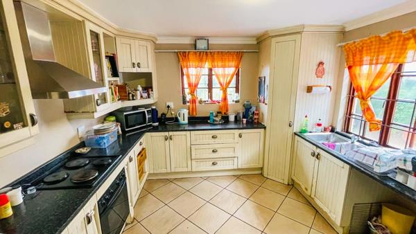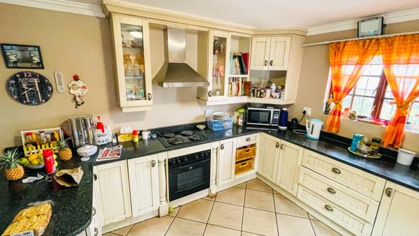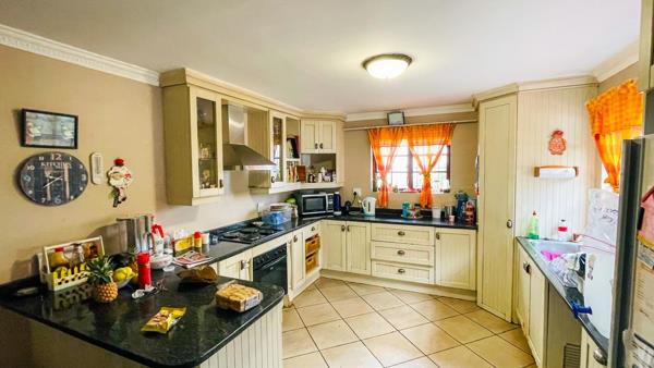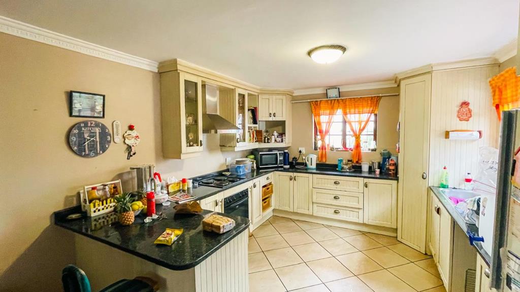 Outside, the property continues to impress with excellent amenities. It includes a double garage, a carport that can accommodate three or more vehicles, as well as additional parking space for guests. The outdoor area is perfect for relaxation and entertaining, featuring a swimming pool and a covered thatched lapa complete with a bar and its own bathroom, fitted with a shower, basin, and toilet.