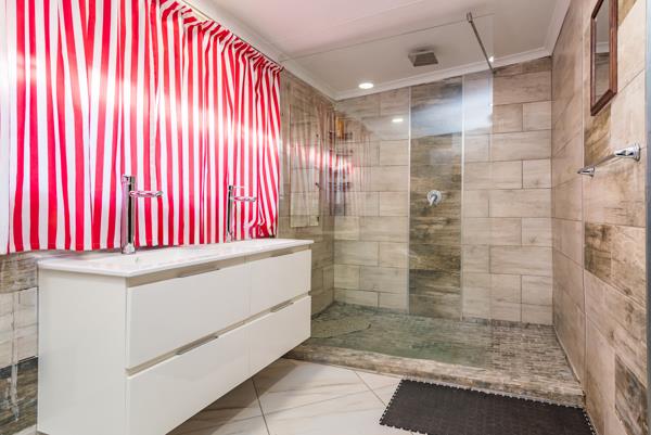 Main house: 4 bedrooms, 3 bathrooms plus study boasting an extraordinarily large and modern kitchen with quartz counter tops, built-in Smeg appliances (gas hob, oven, basins). Additionally, a massive lounge which leads into a huge indoor entertainment area and an extra room/office. Along with all of this, the home has been completely and newly re-tiled and repainted, including new ceiling fans in all the bedrooms. Furthermore, the house is completely powered by 2 x 10kw batteries supported by 12 solar panels, as well as solar geysers and backup gas geysers.