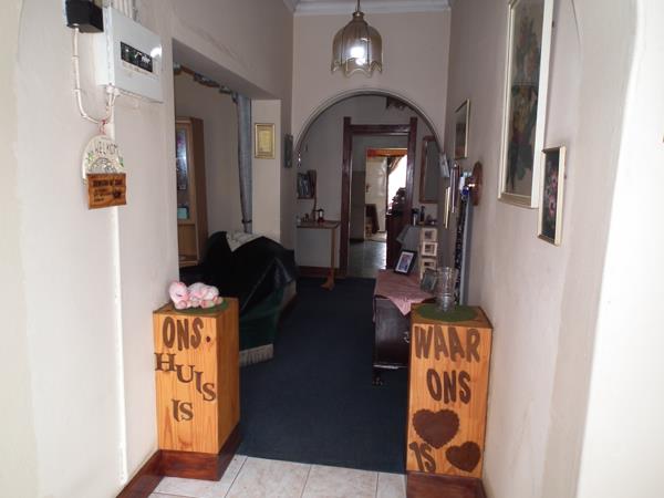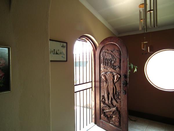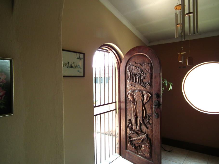 This charming residential property in Krugersdorp West offers a unique blend of character and practicality. The single-story home features a low-maintenance front yard with a entrance, secure parking and 4 garages 1 single and 1 tandem for 3 small cars. Enhanced security includes burglar bars on windows and doors, plus a secure access gate. Step inside through a distinctive, intricately carved wooden entry door into an inviting entrance hall, setting a warm tone.
