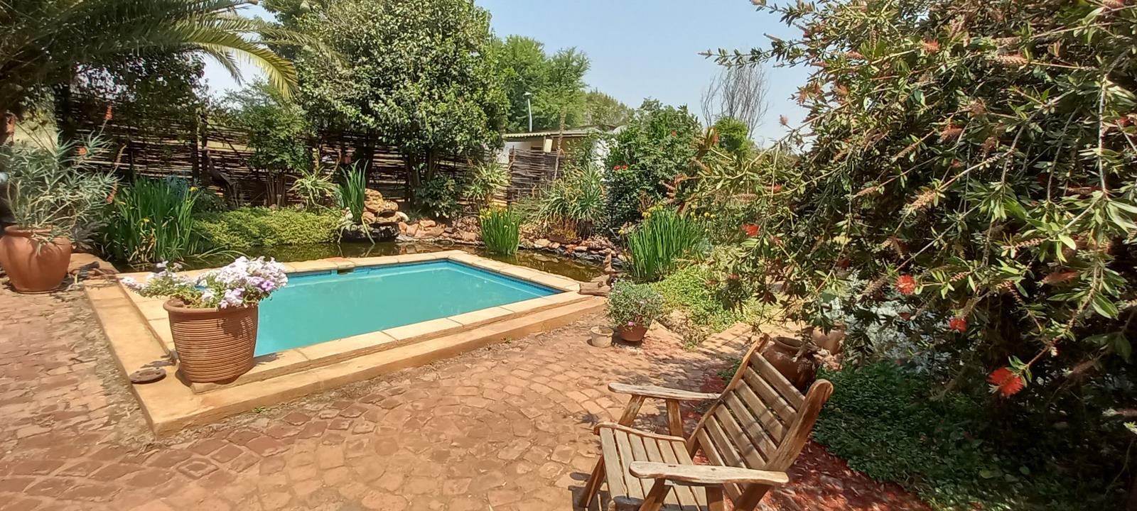 The main farmhouse offers large open plan living areas, a covered lapa with patio overlooking the pool, Koi pond and lush gardens. Well equipped kitchen.