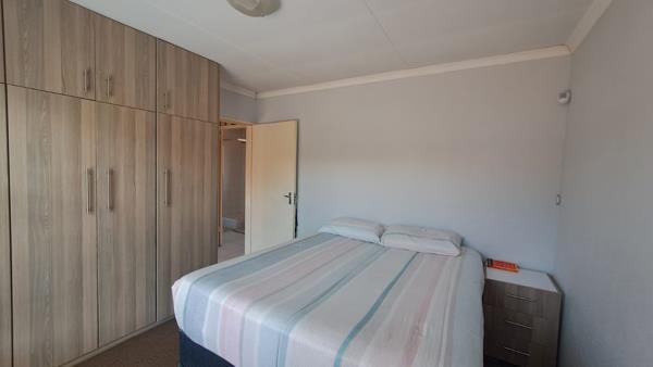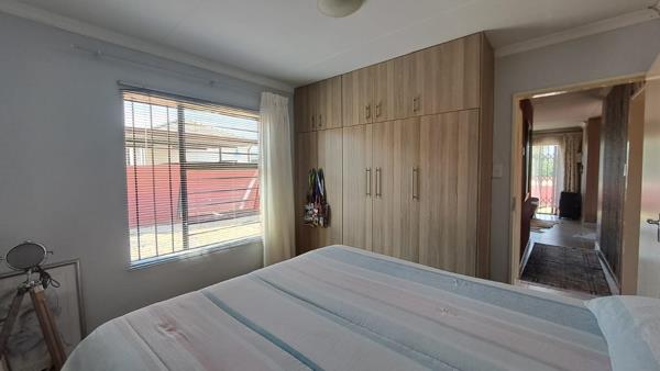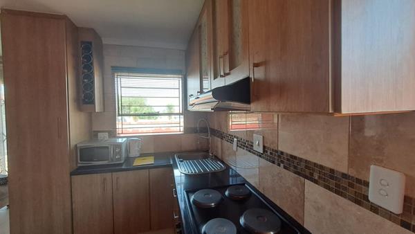 Enjoy a well-maintained home featuring a modern kitchen with built-in cupboards, hob, and under-counter oven, leading to an open-plan lounge with tiled floors. The main bedroom offers laminated flooring, built-in cupboards, and space for a double bed, while the second bedroom includes carpets, blinds, and built-in cupboards ideal for family or guests.